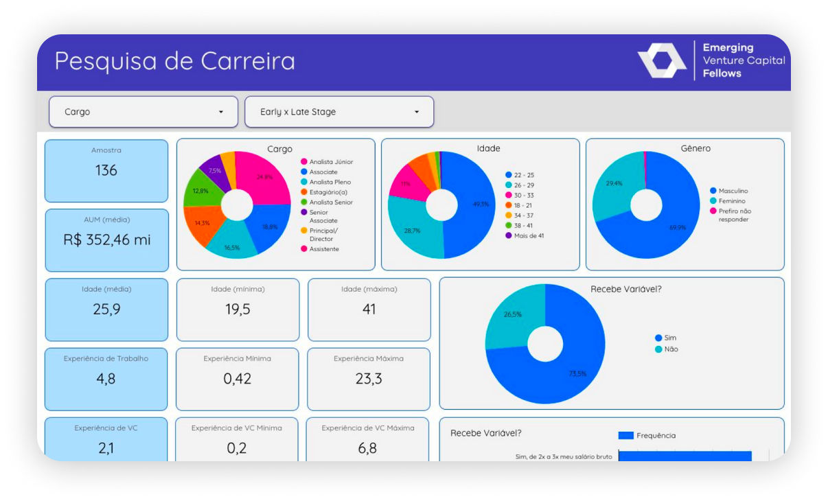 Para facilitar o acesso às principais informações que foram extraídas pela pesquisa, de uma forma simples e de fácil entendimento, foi construído um dashboard interativo que todas as respostas e facilita a visualização dos dados mais pertinentes a partir da utilização de filtros. O dashboard é exclusivo para os associados do EVCF, e para acessá-lo, basta logar com o e-mail pessoal cadastrado no EVCF.